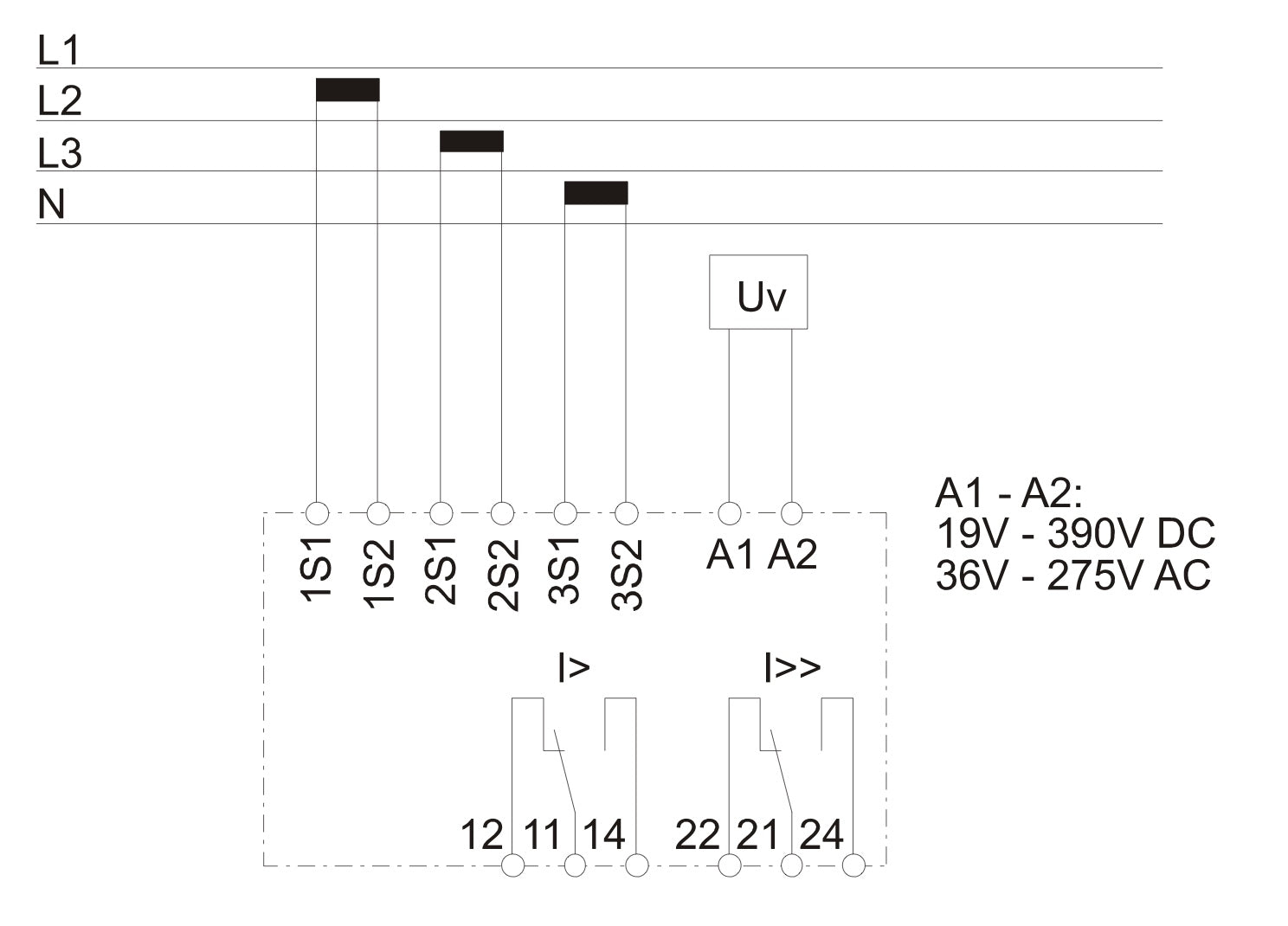 - Nennhilfsspannung 19 ... 390 V DC oder 36 ... 275 V AC (f = 40 ... 70 Hz)